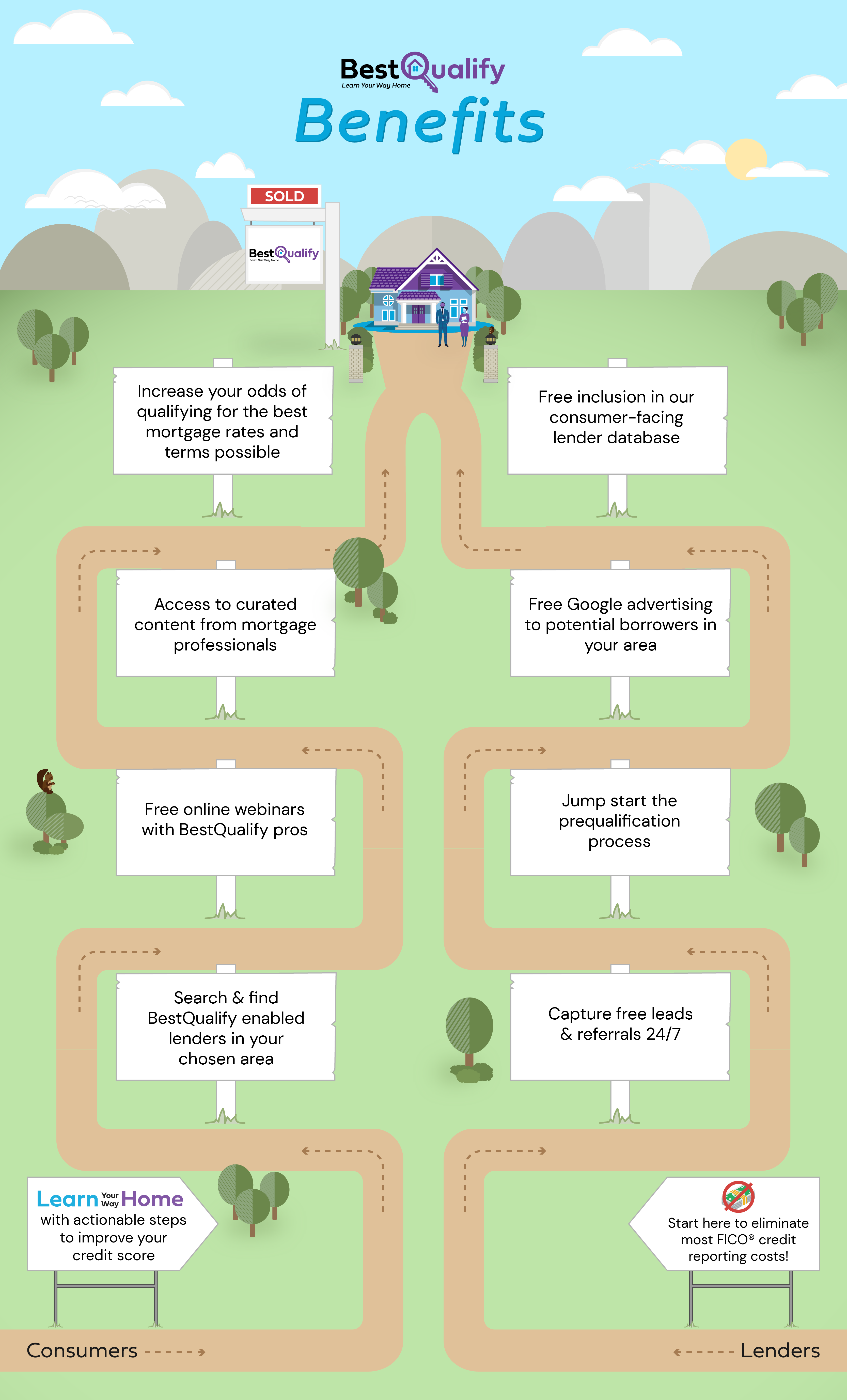 Stop paying for leads! BestQualify delivers better qualified mortgage applicants. You get a free lender portal for every loan originator with an automated prequalification system delivering new buyers 24/7. Each BestQualify referral includes the tri-merge credit report complete with FICO® scores and CreditXpert® tools delivered directly into your LOS.